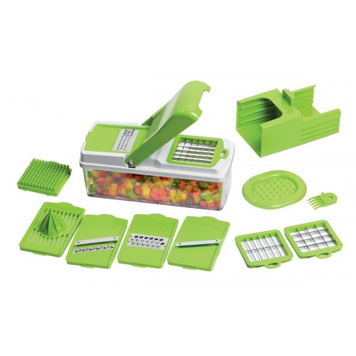 Мультигрейтер — это органайзер (набор) инструментария и аксессуаров для качественной, безопасной и быстрой резки фруктов и овощей, обработки иных пищевых продуктов. Модель WX 17773 включает 12 предметов: 7 вставок различного назначения, а также насадку для приготовления сока из цитрусовых, емкость-контейнер, держатель, подставку, чистящую щетку.